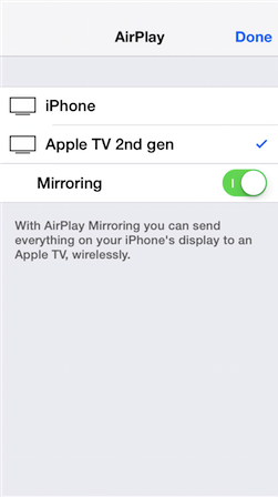 Then, tap the AirPlay button and select the Apple TV or desired device from the list. Under the Apple TV, be sure to turn the toggle switch for Mirroring ON.