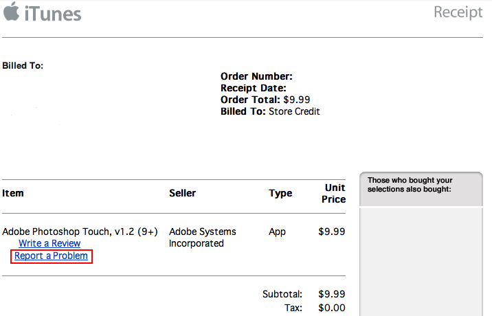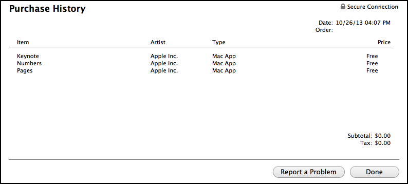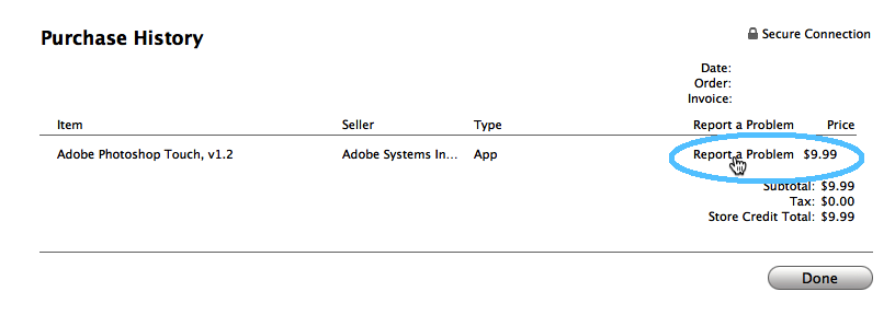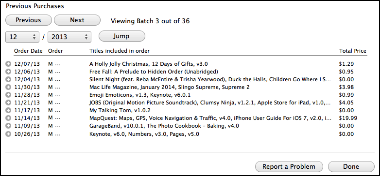 After you sign in, a "Purchase History" window will open and will display information about the order. Once again, you will need to click on the Report a Problem link. The link is the text to the left of the price, as indicated by the mouse pointer's position in the below screenshot.