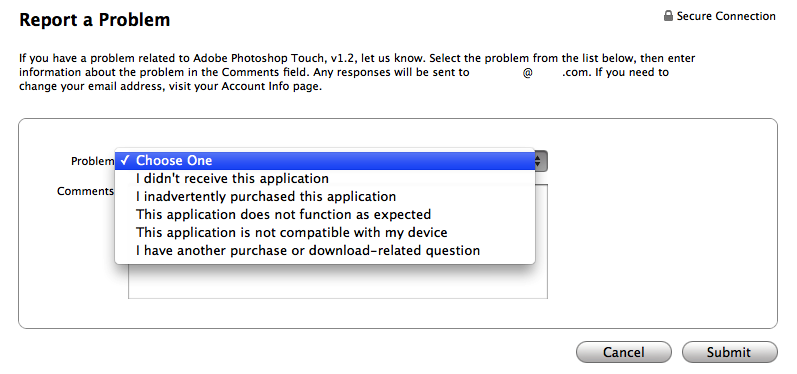After this, you may fill out the form and select what type of problem it is and add any additional comments. After that, you are all set as soon as you click the Submit button in the lower right.