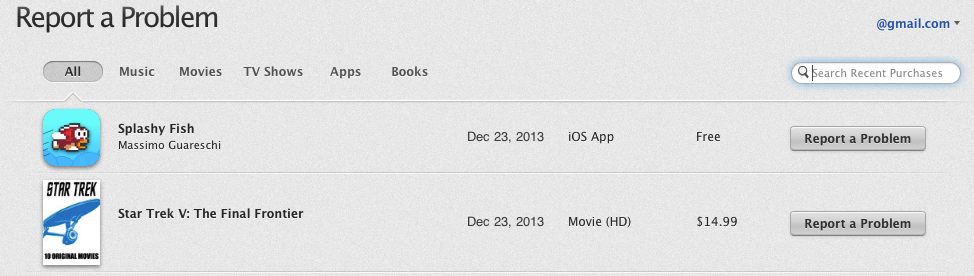 This will take you to reportaproblem.apple.com, where you can select the specific item you want a refund for. If the order is more than 90 days old, it will ask you to contact iTunes Support instead, covered later on in this article.